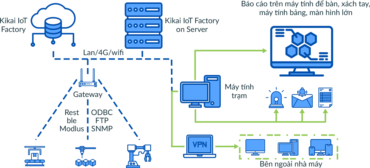 KIKAI FACTORY là giải pháp thu thập dữ liệu lên hệ thống điện toàn đám mây hoặc máy chủ của doanh nghiệp sau đó xử lý dữ liệu và cung cấp báo cáo và cảnh báo theo thời gian thực. Hỗ trợ đa giao thức, đa nền tảng, có tính năng điều khiển từ xa, dễ lắp đặt và thời gian triển khai nhanh.
